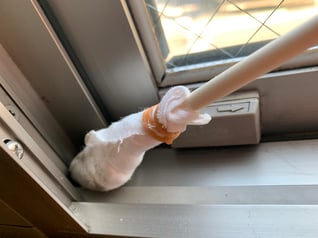 それから、小さくカットしたウエスを割り箸の先に巻きつけて輪ゴムで止めるだけで、サッシの汚れ取りに活躍するお掃除アイテムに変身!