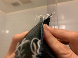 ジーンズの裾を切ったウエスは、歯磨き粉をつけて、お風呂の鏡を磨くと水アカが取れてピカピカに。ジーンズのウエスは、シンクの掃除にも使える万能ウエスです。