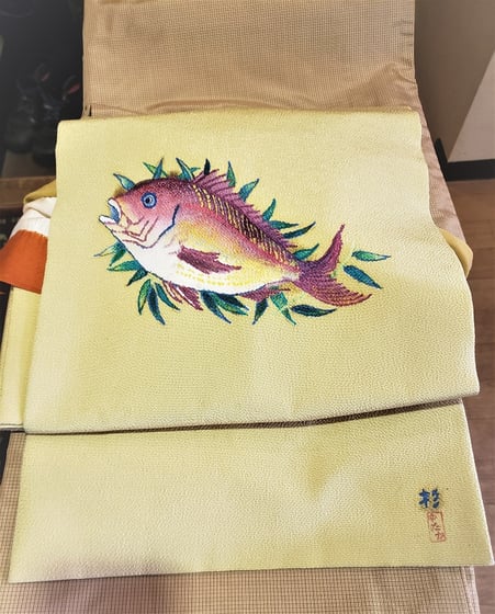 私の退職祝いに夫が描いてくれた手描き友禅の帯。題して「目出鯛」。初めて締めたのは大勢の方が祝ってくださった退職パーティーの時。私から皆さまにお礼の意味を込めて、ご披露させていただきました。