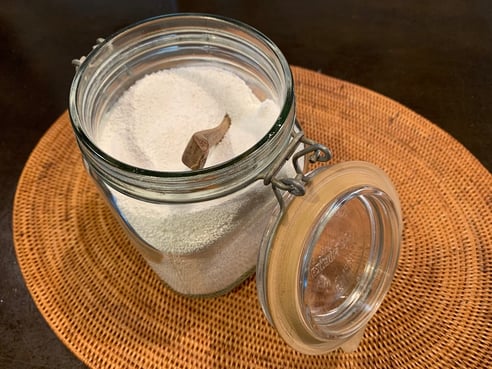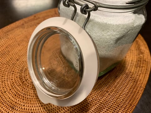 古い瓶ですが、ゴムパッキンひとつの交換だけでまだまだ現役で使え、我が家にあるどんな保存瓶よりしっかり密封されるようになりました。この瓶を長く使うことで、プラスチックの箱入り洗剤を買わない!少しでもプラスチック削減の取り組みになるといいな!と思いました。
