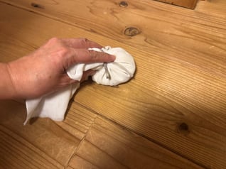 磨くうちに木目がくっきり見えて、自然の艶が出てきました。また、米ぬかを入れたさらしに汚れが付いているので、水拭きで取れなかった汚れも取れたようです。米ぬかは自然素材なので、小さなお子さんがいるご家庭でも安心ですね。