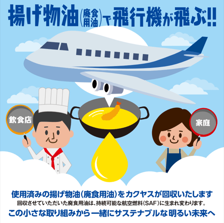 使い終えた天ぷら油(廃食油)は、油凝固剤で固めたり、新聞などに染み込ませたりして捨てていませんか? 実はこの廃食油、捨てずに再利用すれば飛行機の燃料「持続可能な航空燃料(SAF)※」に生まれ変わります。SAFは、廃食油やバイオマスなどの非化石原料を原料とするため、燃焼時に排出されるCO₂の量が少なく、航空業界の脱炭素化に大きく貢献します。資源の限られた日本において、持続可能なエネルギーとして注目されています。