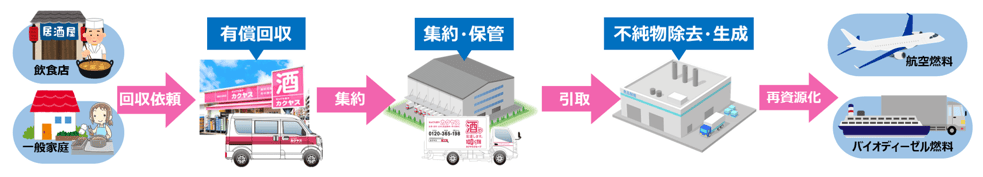 そしてカクヤスは、国内でSAFを精製する株式会社レボインターナショナルとタッグを組み、廃食油を再資源化する仕組みを構築しました。