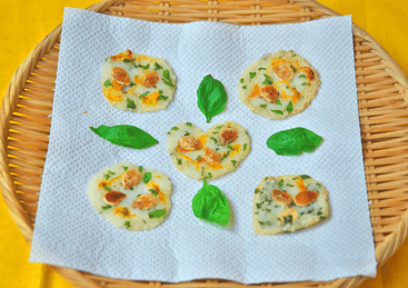 - 余りごはんに1とバジルを混ぜ合わせ、薄くのばしてお好きな形に成型します。