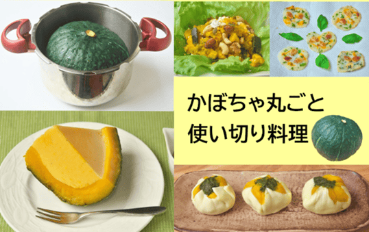 圧力鍋を活用した時短調理で省エネルギーを意識しつつ、蒸したかぼちゃ丸ごと1個を利用して4品作ってみましょう。