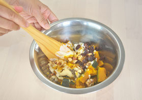 ① 蒸しかぼちゃにヨーグルトとマヨネーズを加え混ぜます。