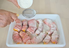 ② ➀に豚バラ肉をグルグル巻きつけ、小麦粉をまぶします。