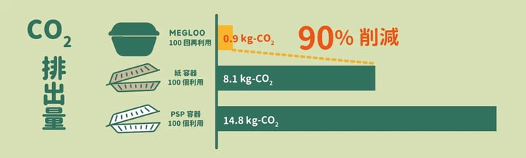 実際に、ライフ・サイクル・アセスメント(※2)分析によると、Megloo容器と使い捨て紙容器を比較してCO2排出量が9割減少するそう。(※3)