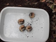 切り倒された丸太をひっくり返してみましょう。すると子供たちに大人気のカブトムシの幼虫が何匹も見つかりました。幼虫は丸太の下の腐葉土を餌に冬を越すのです。