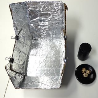 (左上)使用するのは3つ。手作りソーラークッカーと空き缶とウズラの卵